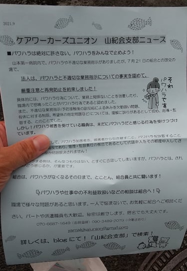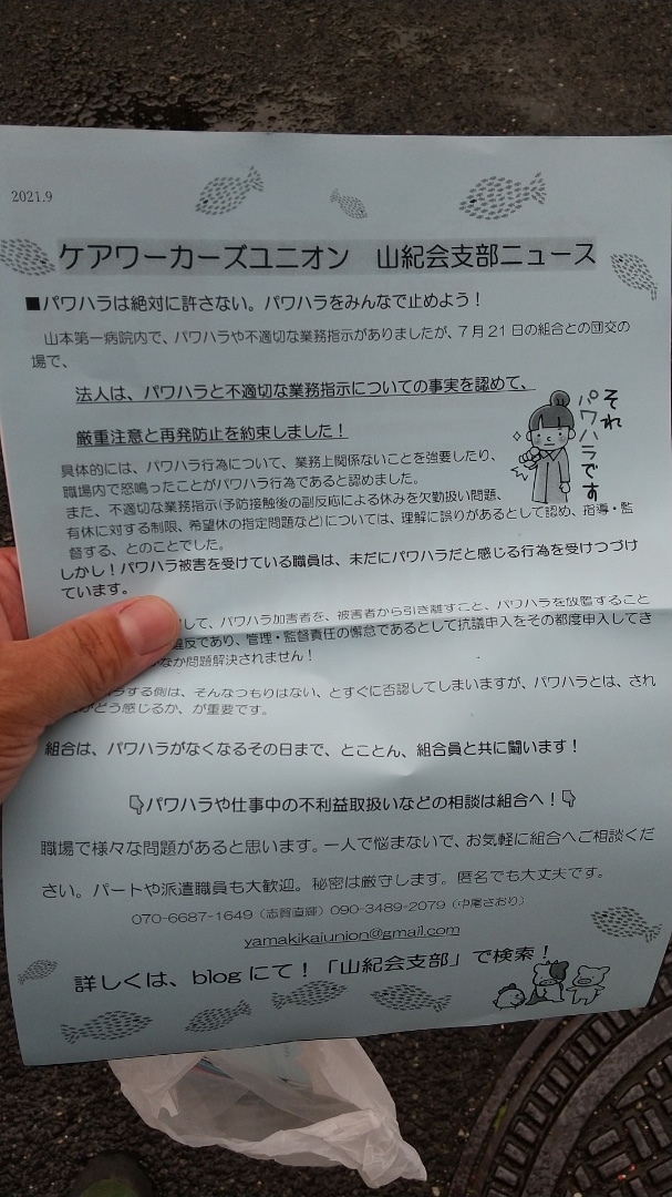本日から、山本第一病院前と天下茶屋駅前の職員バス乗場前、本部前にて以下のビラ配りをしています!!