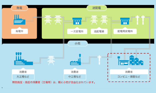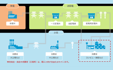 エネ庁のサイトによれば、電力供給の仕組みとは、発電所→送電線→変電所→配電線の経路をたどり、各家庭まで供給されている。(「電力供給の仕組みの図」参照)新電力は、発電会社から電気を買うか自社の発電所で発電した電気を、送配電会社が保有する送電網を使い契約者の家庭へ送電している。