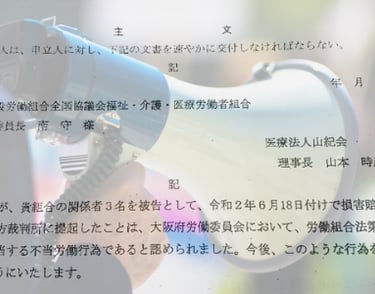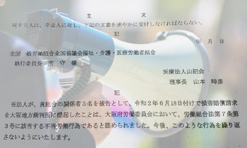 2022年2月18日、大阪府労委より、医療法人山紀会が組合員3名に対して起こした損害賠償請求訴訟が不当労働行為(支配介入)に該当するという勝利命令が出されました!!