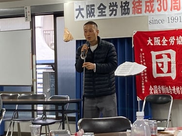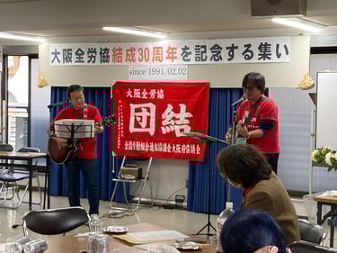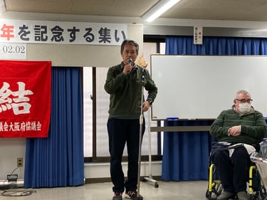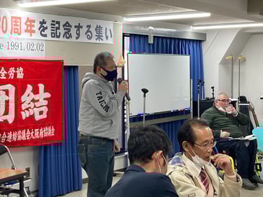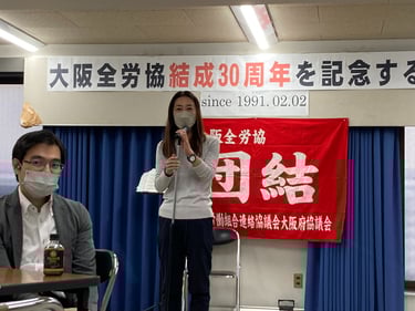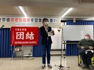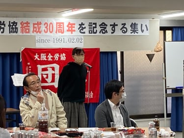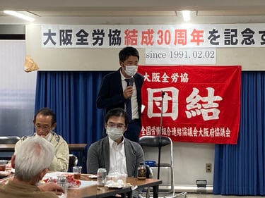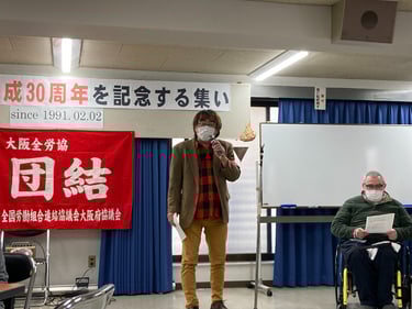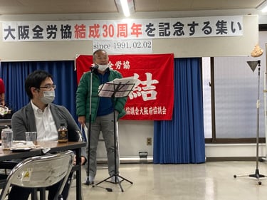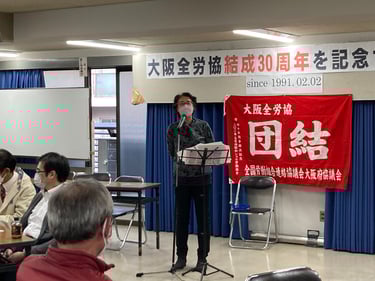 さる11月19日、PLP会館で< 大阪全労協結成30周年を記 念する集い>が開かれた。コロ ナ対策のため外部来賓招請な しで加盟労組組合員と事務 局役員、それに議長経験者で ある4名の顧問が参加した。